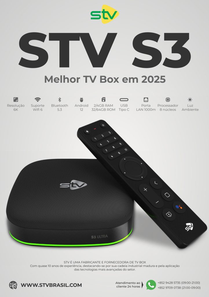 STV S3 Pro - 6K - 2/32GB - Wi-Fi - Bluetooth - Android 12 - Comando de voz - 2025 Receptor IPTV (Sem Antena) STV S3 Pro - 6K - 2/32GB - Wi-Fi - Bluetooth - Android 12 - Comando de voz 2025     ... R$ 625,90