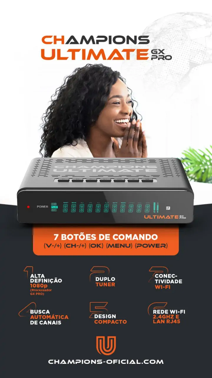 Champions Ultimate Gx Pro Receptor Champions Champions Ultimate Gx Pro   Receptor Champions Ultimate GX PRO: Desfrute de imagens Full HD 1080p com o processador GX6628 e conectividade versátil via Wi-Fi e Ethernet. Navega&c... R$ 455,90
